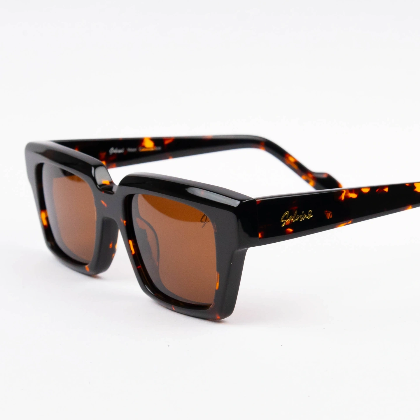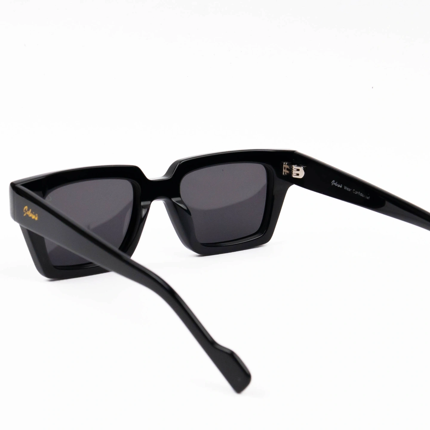 Frame Style: Bold geometric square silhouette with a distinct angular dropped bridge.