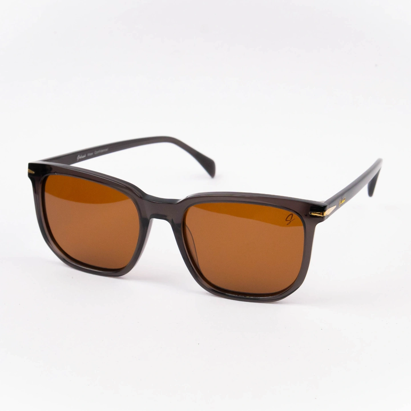 Details: Lightweight transparent acetate with visible inner hinge hardware and subtle logo etching on the lens.
